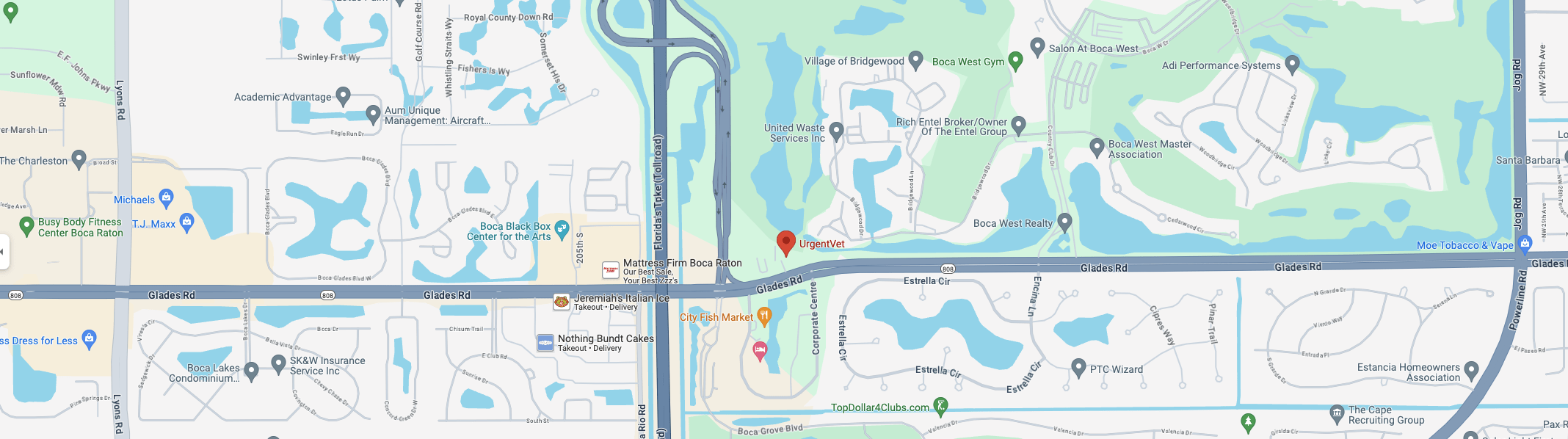 UrgentVet Boca Raton vet clinic is an urgent pet care clinic and after-hours veterinarian conveniently located at 7775 Glades Rd Suite 100b in Boca Raton, Florida, on Glades Road just east of the turnpike in the Starbucks shopping center across from City Fish Market. Our compassionate professionals offer same-day appointments and walk-in veterinary care for cats and dogs in the local area.
