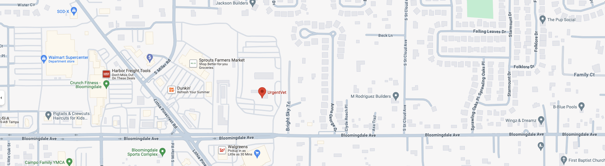 UrgentVet Brandon vet clinic is an urgent pet care clinic and after-hours veterinarian located at 2446 Bloomingdale Ave, Valrico, FL, 33596. We’re just off Bloomingdale Road and Lithia Pinecrest Road, right next to BayCare Urgent Care. Our compassionate veterinarian team offers same-day appointments and walk-in veterinary care for cats and dogs in the local area.